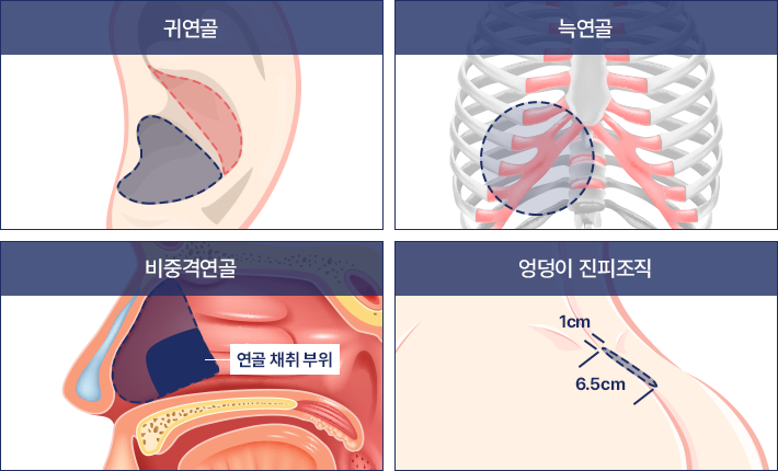 - 귀 연골, 비중격 연골, 늑연골(가슴연골), 자가 진피를 이용하여 코 기둥, 콧대, 코끝을 교정합니다.